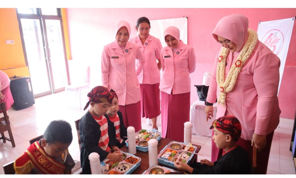 Istri dari Kapolda Jatim, Irjen Pol Imam Sugianto didampingi Ketua Bhayangkari Cabang Sumenep Ny. Agnes Henri mengecek langsung jalannya makan bergizi gratis yang diberikannya di ruang kelas TK Kemala Kemala Bhayangkari 81 Sumenep.