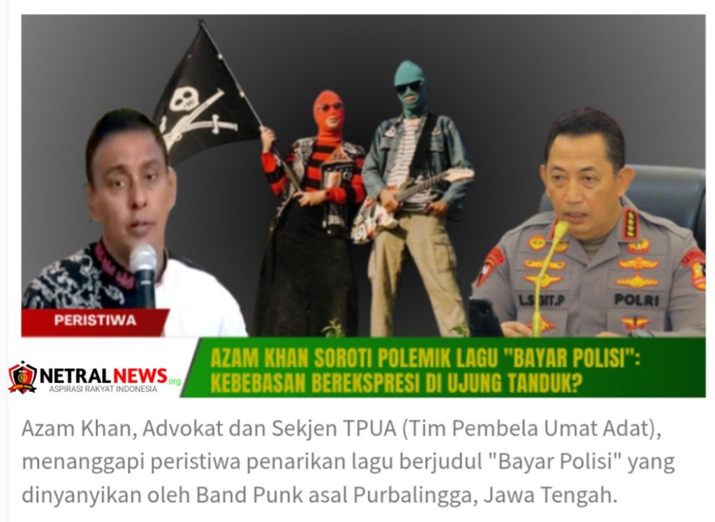 Netralnews.org : Kontroversi mengenai lagu “Bayar Polisi” yang viral di media sosial semakin memanas. Lagu yang dinyanyikan oleh band punk asal Purbalingga, Sukatani, tiba-tiba ditarik dari semua platform pemutar musik, memicu dugaan adanya tekanan dari pihak tertentu. Advokat sekaligus Ketua Umum Kontra’sm dan Sekretaris Jenderal Tim Pembela Umat Adat (TPUA), Azam Khan, menilai bahwa kejadian ini merupakan ancaman serius terhadap kebebasan berekspresi.